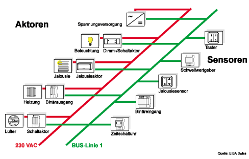 KNX wurde als System (Weiterentwicklung des EIB “Europäischer Installationsbus”) entwickelt, das für alle wichtigen Aufgaben in der Gebäudetechnik eingesetzt werden kann. Damit können die einzelnen Anlagenteile, die sogenannten« Gewerke», wie Heizung, Lüftung, Beleuchtung, Alarmanlage usw. gemeinsam («integral») geplant und ausgeführt werden. Jeder Hersteller hält sich an die definierte Norm, so dass sich alle Geräte gegenseitig verstehen und miteinander vernetzt werden können.